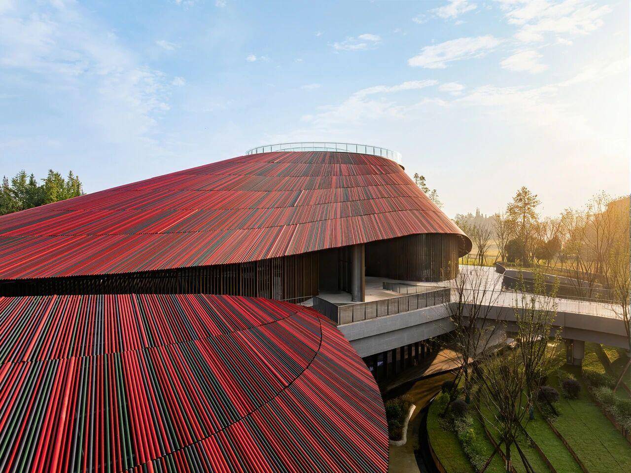 二是色彩与文化的呼应。设计采用了源于豆瓣制作工艺的色彩体系,屋顶设计为 “彩椒顶”,融合绿色、灰色、红色、深红色四种颜色 —— 对应二荆条从生长到制成豆瓣的颜色变化,让建筑本身成为豆瓣文化的视觉表达。