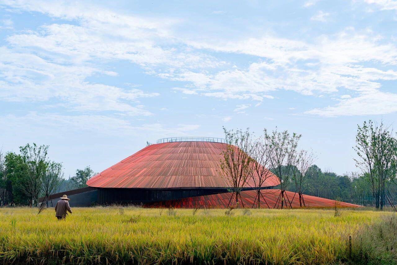 一是体量与环境的共生。设计团队将 2/3 的体量(4200㎡)置于地下,地上仅保留 2000㎡,并控制建筑高度在 15 米,让建筑掩映在林盘与农田之间,避免突兀,实现与自然环境的和谐共生。